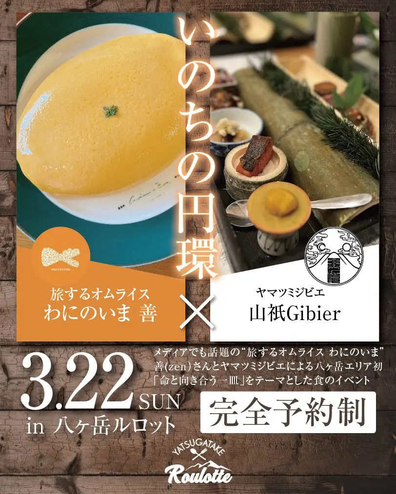 八ヶ岳&南アルプスの恵み、ジビエ・新鮮野菜をふんだんに取り入れた健康的なお料理 人工甘味料や添加物、酵母エキスなど不使用で安心・安全のお料理 ホットドッグやカレー、ステーキなど誰もが大好きなメニューを、ジビエやグルテンフリー、ヴィーガンなどのヘルシー食材で調理。化学調味料を使わずに、麹で調味料から手作りし、ハーブ&スパイスも日本人に合うように程よく調味しました。 ヴィーガン、グルテンフリー対応 一つのテーブルを囲み様々な食の嗜好を持つ人々が集まり楽しめる場 様々な食の嗜好を持つ全ての方が一同に食を楽しめる場 それが八ヶ岳ルロット。ヴィーガン、グルテンフリー対応だけどボリューム満点で美味しく、味もしっかり楽しめるお料理を提供します。 REUSE お店はREUSEをテーマに、産廃された板、敷地内に廃棄された鉄屑、木材…それらをお店の至る所に活かしREMAKEしました。海外の田舎のカフェのような落ち着いた空間を是非お楽しみください。 BLOG メディアでも話題の 旅するオムライス わにのいま 善さんとヤマツミジビエ・八ヶ岳ルロットによる【いのちの円環】 旅と土地に導かれ、八ヶ岳のトマト農園でのご縁とジビエ会をきっかけに繋がった三人。… 3月営業日のご案内 お待たせしております。3月の営業日になります。予めご了承くださいませ。よろしくお… 2月営業日のご案内 2月の営業日になります。今月一時的にお休みをいただきます。予めご了承くださいませ… Instagram LINEお友達追加 CAFE&DINER 八ヶ岳ルロット アクセス 車 :小淵沢インターより道の駅方面へ約30秒住所 山梨県北杜市小淵沢町2969−1電話 080-2399-6030 営業時間月・火 11:00〜14:00水・金・土 11:00〜17:00日 11:00〜21:00(15:00〜17:00一時閉店)定休日木曜日予約予約可席数17席設備テイクアウトOK、テラスあり、駐車場10台以上