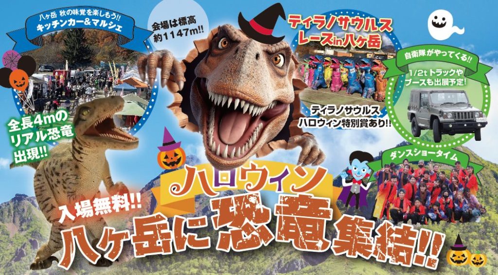 10月19日(日) 北杜市甲斐温泉パノラマの湯 敷地内キャンプ場にて 八ヶ岳に恐竜が集結! ティラノサウルスレース in八ヶ岳を開催いたします。ティラノサウルスレース以外にも様々なコンテンツ満載でお待ちしております。 ●