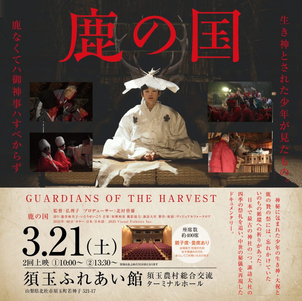 映画「鹿の国」上映のお知らせ 日時:3/21(土) 午前・午後2回上映 ①10:00〜 ②13:30〜 場所:北杜市須玉ふれあい館 ドキュメンタリー映画として異例の大ヒット 映画「鹿の国」山梨県西部 初上映! なぜこの土