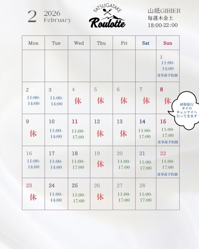 2月の営業日になります。今月一時的にお休みをいただきます。予めご了承くださいませ。よろしくお願いいたします。
